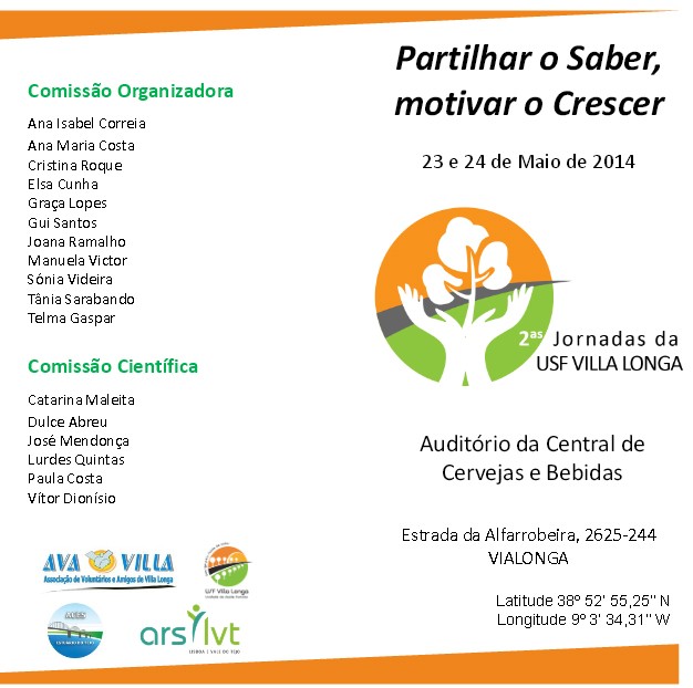 "Partilhar o Saber, motivar o Crescer" é o lema das 2as Jornadas da Unidade de Saúde Familiar (USF) Villa Longa, que se realizam nos dias 23 e 24 de maio, em Vialonga, no Auditório da Central de Cervejas e Bebidas.