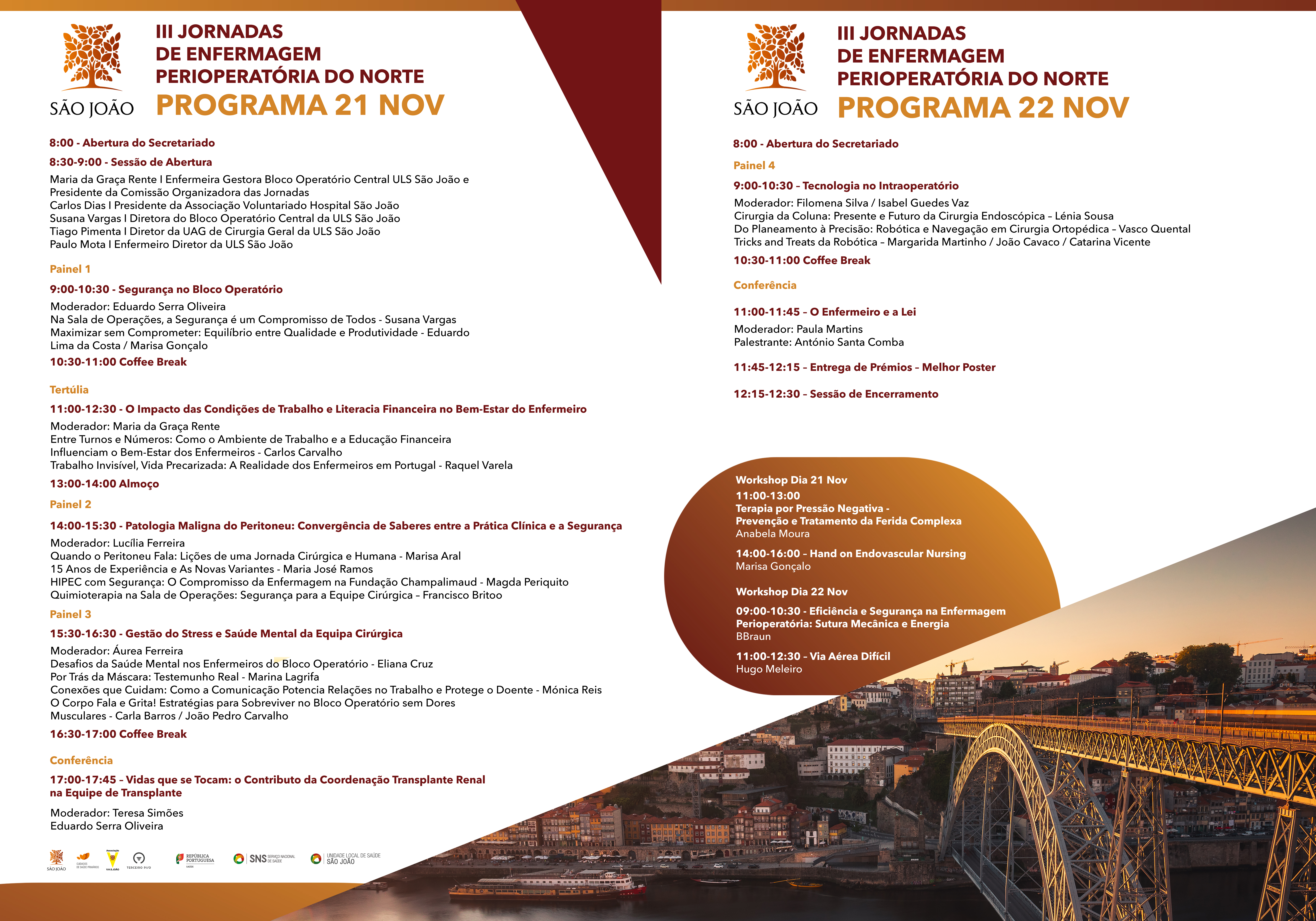 Organizado pelos enfermeiros do Bloco Operatório Central da ULS São João, o evento permitirá o debate de temas como "patologia maligna do peritoneu: Convergência de saberes entre a prática clínica e a segurança" ou "Gestão do stress e saúde mental da equipa cirúrgica".