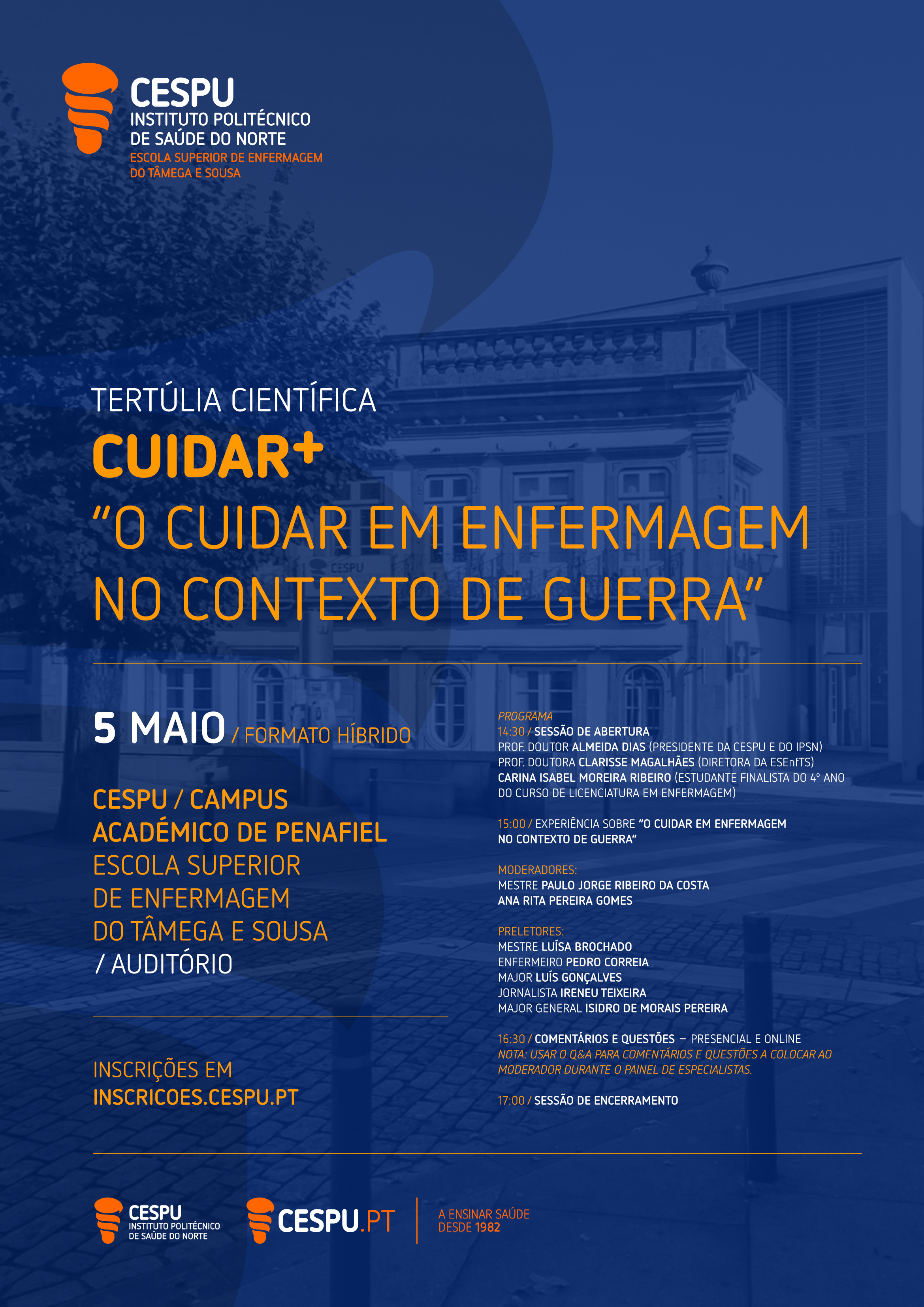 "CUIDAR mais: O papel dos Enfermeiros no contexto de Guerra" é o tema da Tertúlia Científica organizada pela Escola Superior de Enfermagem do Tâmega e Sousa do Instituto Politécnico de Saúde do Norte - CESPU, que se irá realizar no dia 5 de maio em formato híbrido - online e presencialmente no Campus Académico de Penafiel.