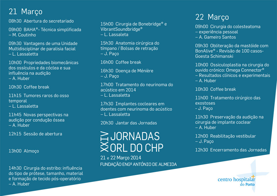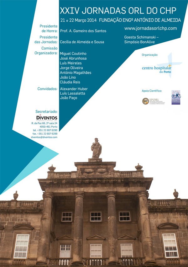 Dias 21 e 22 de março de 2014 realiza-se, na Fundação Eng.º António de Almeida, a 24ª edição das Jornadas de Otorrinolaringologia do Centro Hospitalar do Porto. A reunião conta com o apoio científico da Sociedade Portuguesa de Otorrinolaringologia e Cirurgia Cérvico-Facial (SPORL) e da Associação Portuguesa de Otoneurologia (APO).