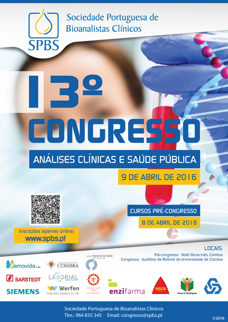 A Sociedade Portuguesa de BioAnalistas Clínicos (SPBS) vai realizar o 13º Congresso de Análises Clínicas e Saúde Pública ao longo dos dias 8 e 9 de abril, no Auditório da Reitoria da Universidade de Coimbra. O primeiro dia é dedicado à realização de vários cursos, que se realizam no Hotel Dona Inês.