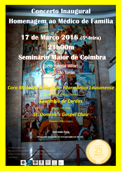 Aberto a toda a população, e de entrada gratuita, o concerto de homenagem ao médico de família realiza-se dia 17 de março, em Coimbra, no âmbito das comemorações dos 25 anos de ensino de Medicina Geral e Familiar (MGF) na Faculdade de Medicina da Universidade de Coimbra (FMUC). Esta é uma das várias ações que serão dinamizadas sob a coordenação de Hernâni Caniço, membro fundador e coordenador na Unidade Curricular de MGF da FMUC.
