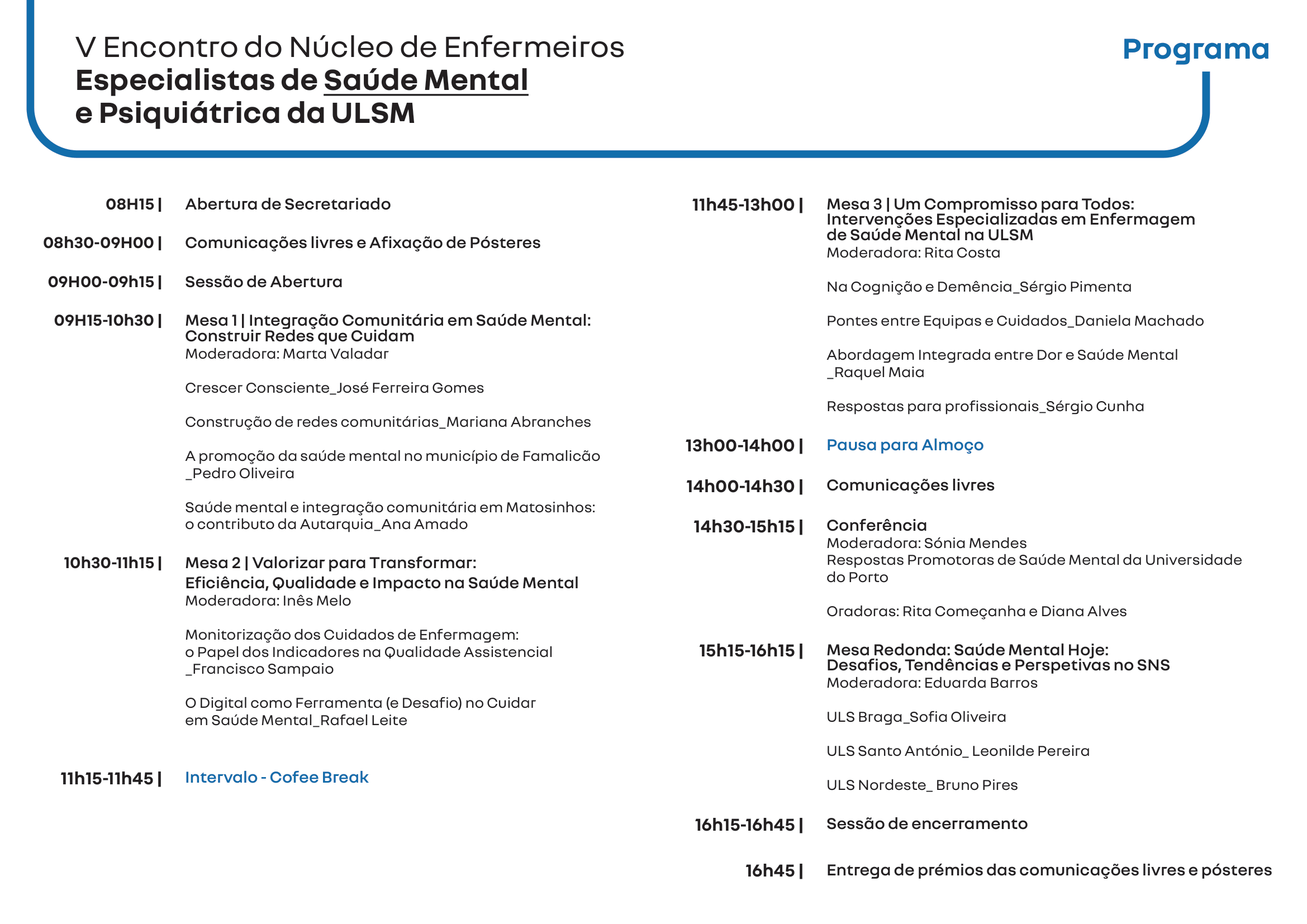 Dia 22 de maio realiza-se o V Encontro Núcleo de Enfermeiros Especialistas de Saúde Mental e Psiquiátrica da ULS de Matosinhos, que decorrerá no Auditório do Hospital Pedro Hispano.
