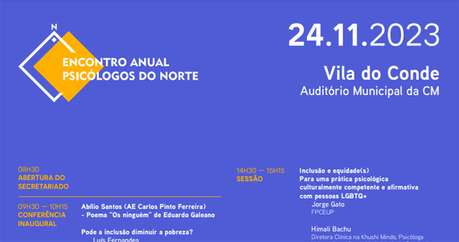 Agendado para dia 24 de novembro de 2023, o V Encontro Regional dos Psicólogos do Norte permitirá o debate de temas como "Inteligência Artificial: uma visão intergeracional" e "Inclusão e equidade(s). Para uma prática psicológica culturalmente competente e afirmativa com pessoas LGBTQ+".