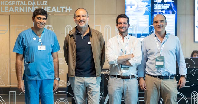 Os neurocirurgiões do Hospital da Luz que fizeram a formação nas sessões de simulação com o coordenador do evento: Álvaro Lima, Maia Gonçalves, Miguel Casimiro e Bruno Santiago
