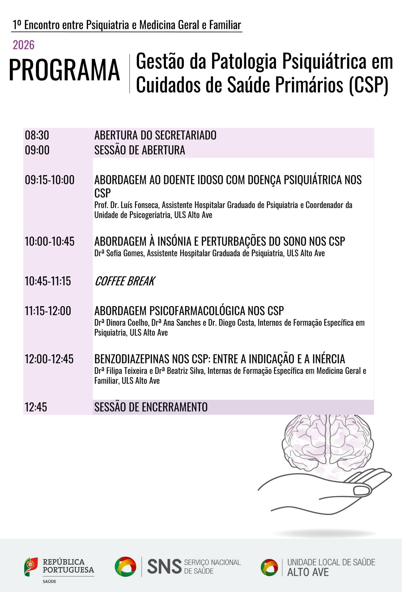 O evento, que será dedicado à "Gestão de patologia psiquiátrica em cuidados de saúde primários", tem início com uma palestra sobre "Abordagem ao doente idoso com doenças psiquiátricas nos cuidados de saúde primários", a cargo de Luis Fonseca, assistente hospitalar graduado de Psiquiatria e coordenador da Unidade de Psicogeriatria da ULS Alto Ave.