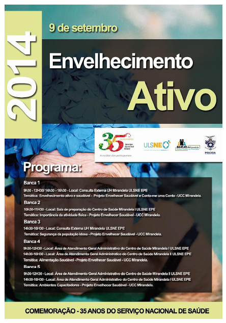 O "Envelhecimento Ativo" é o tema central das atividades que a Unidade Local de Saúde (ULS) do Nordeste vai organizar, dia 9 de setembro, com o propósito de assinalar os 35 anos do Serviço Nacional de Saúde. O evento vai decorrer em Mirandela e conta com a participação do secretário de Estado da Saúde, Manuel Teixeira.