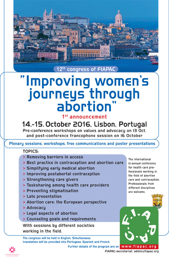 "Improving women’s journeys through abortion" é o lema do 12º Congresso da International Federation of Professional Abortion and Contraception Associates- FIAPAC. O evento realiza-se em Lisboa, nos dias 14 e 15 de outubro de 2016, com o apoio da Sociedade Portuguesa da Contracepção.
