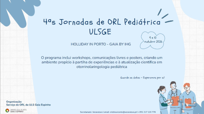 O Serviço de Otorrinolaringologia da ULS Gaia e Espinho organiza, nos dias 9 e 10 de outubro de 2026, as 4as Jornadas de Otorrinolaringologia Pediátrica.