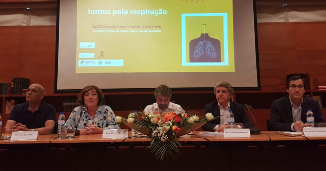 A mesa da sessão de abertura do encontro “Juntos pela Respiração” esteve bem preenchida. Para além de Ana Tato Aguiar, que também teve a responsabilidade de representar o presidente da ARS Norte, e de Sanchez Silva, estiveram presentes António Barbosa, presidente do Conselho de Administração do CH do Médio Ave, Pedro Neves, adjunto da Direção Clínica do CHMA, e José Pedro Machado, vereador da Saúde, em representação do presidente da CM de Santo Tirso.
