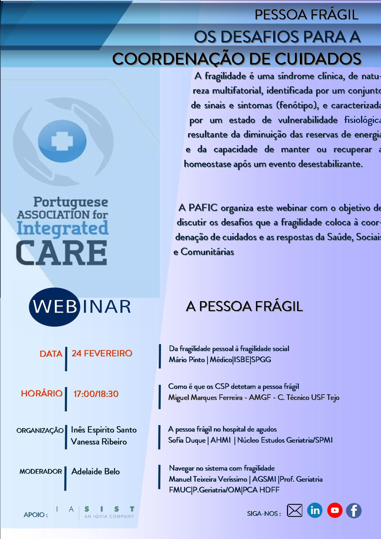 O webinar "Pessoa frágil - Os desafios para a coordenação de cuidados" realiza-se hoje e no dia 3 de março, entre as 17h00 e as 18h30. Cada uma das sessões conta com diferentes oradores, que partilharão variadas perspetivas.
