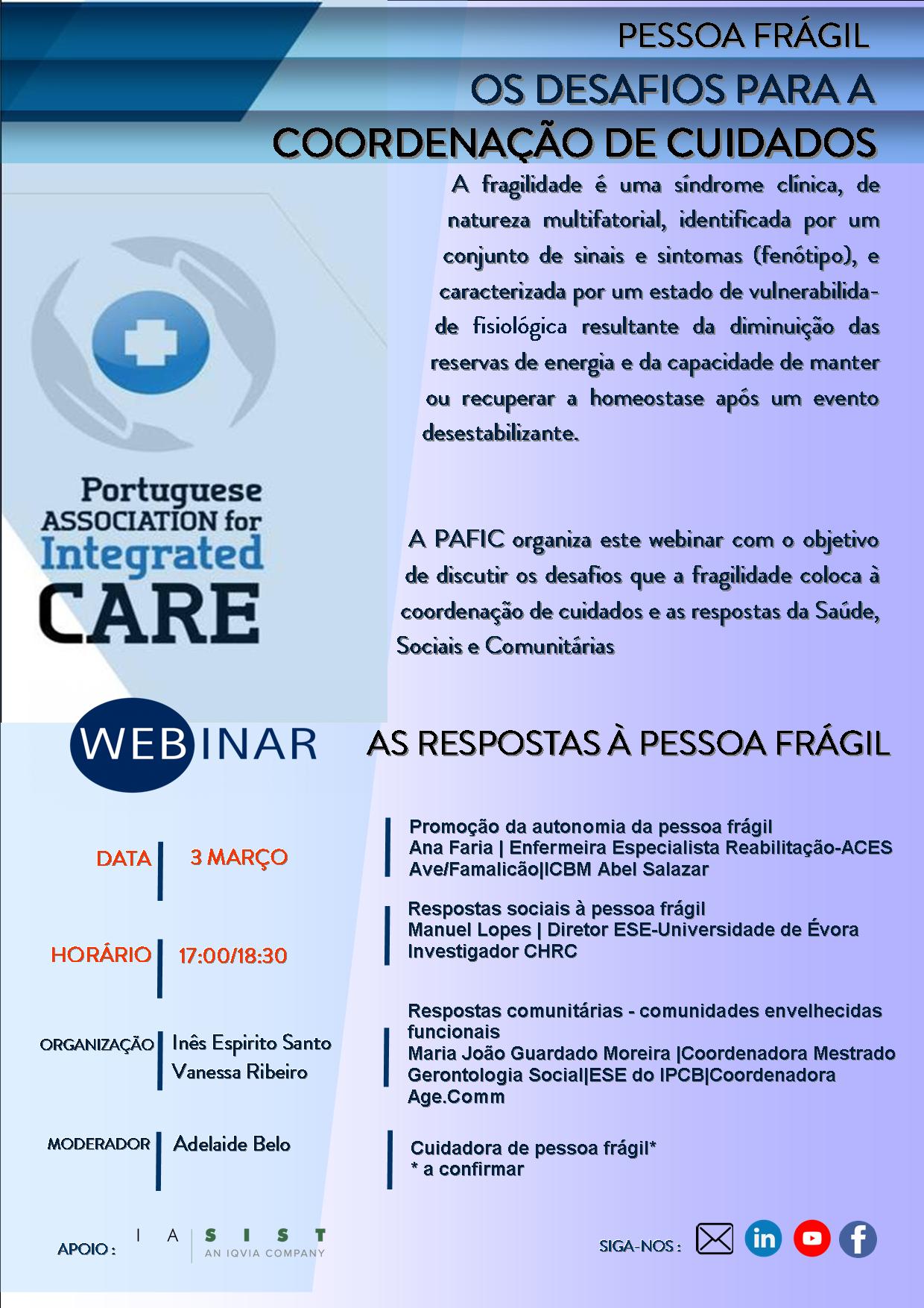 Para a presidente da PAFIC, Adelaide Belo, o webinar é uma oportunidade para falar, ainda mais, sobre as mudanças sociodemográficas que se vivem em Portugal. Um estudo europeu de 2019 identificou mesmo, na população portuguesa, 15,6% de idosos frágeis e 47,6% de idosos pré-frágeis.