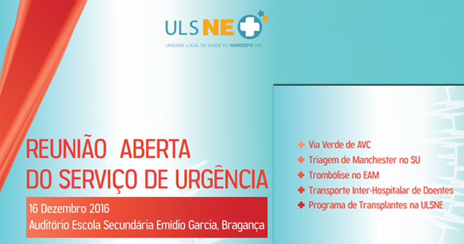 O Serviço de Urgência da Unidade Local de Saúde do Nordeste (ULSNE) vai realizar, dia 16 de dezembro, uma Reunião Aberta, que terá lugar no Auditório da Escola Secundária Emídio Garcia, em Bragança.