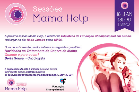 A próxima sessão informativa promovida pela associação Mama Help realiza-se dia 18 de janeiro, na Biblioteca da Fundação Champalimaud, em Lisboa. Sendo particularmente dirigida a doentes e familiares, a iniciativa está também aberta à população e é de entrada livre a todos os interessados.