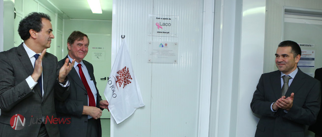 Robert Mansel, representante da EUSOMA (European Society of Breast Cancer Specialists), descerra a placa comemorativa da atribuição da certificação EUSOMA, junto com Fernando Araújo, secretário de Estado adjunto e da Saúde, e o próprio José Luís Fougo.