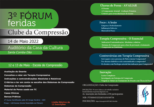 Organizado pelo Clube da Compressão, o 3.º Fórum Feridas realiza-se no dia 14 de maio, no Auditório da Casa da Cultura, em Santa Comba Dão.