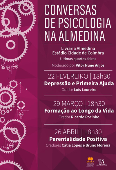 A 3.ª edição de "Conversas de Psicologia na Almedina" em Coimbra tem início esta quarta-feira, 22 de fevereiro, às 18h30. O tema, dedicado à "Depressão e primeira ajuda", será abordado por Luís Loureiro. A entrada é gratuita.