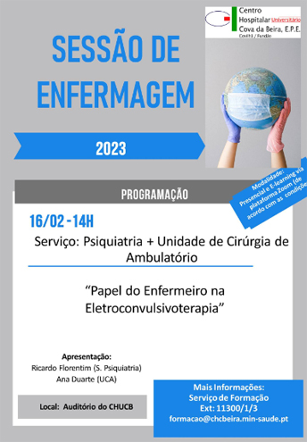 O Centro Hospitalar Universitário da Cova da Beira (CHUCB) organiza, dia 16 de fevereiro, mais uma sessão de Enfermagem, agora dedicada ao tema: "Papel do Enfermeiro na Eletroconvulsivoterapia". O evento decorrerá no Auditório do centro hospitalar, na Covilhã, tendo também transmissão online.