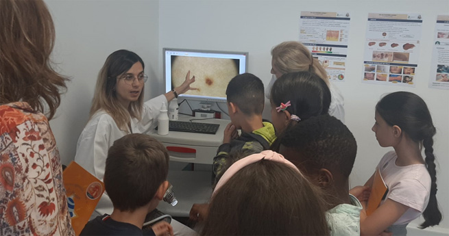 Além dos rastreios, que habitualmente decorrem também em várias unidades de saúde pelo país, foram abertas as portas do Serviço à turma do 4.º B do Ensino Básico da Escola Raul Lino (Alcântara) do Agrupamento Francisco Arruda, numa promoção de literacia em saúde junto dos mais novos, em particular, nos cuidados a ter com a pele.
