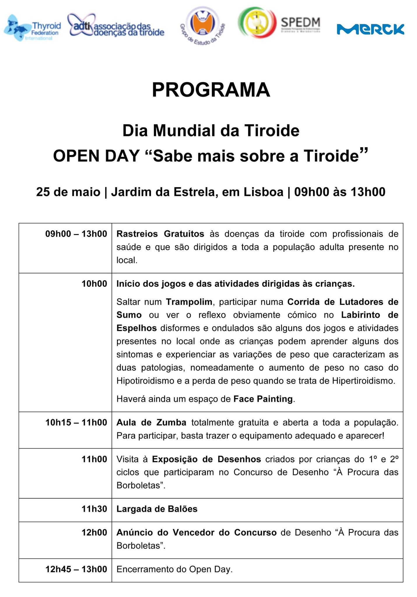 Com o propósito de sensibilizar as crianças para a forma da tiroide, que se assemelha a uma borboleta, haverá uma exposição com desenhos criados por crianças do 1º e 2º ciclos e pinturas faciais. O programa inclui ainda uma largada de balões, uma aula de zumba e rastreios gratuitos para os adultos.