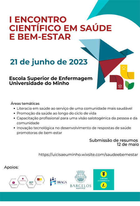 Organizado pelo Núcleo da Unidade de Investigação em Ciências da Saúde: Enfermagem, da Universidade do Minho (UICISA:E), o I Encontro Científico de Saúde e Bem Estar está agendado para o dia 21 de junho de 2023, e irá decorrer em formato híbrido - online e presencialmente na Escola Superior de Enfermagem da Universidade do Minho, em Braga.