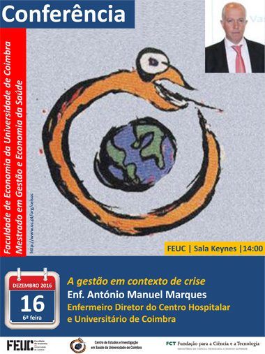 A Faculdade de Economia da Universidade de Coimbra (FEUC) acolhe amanhã, sexta-feira, mais uma conferência promovida pelo Centro de Estudos e Investigação em Saúde da Universidade de Coimbra (CEISUC). António Manuel Marques, enfermeiro diretor do Centro Hospitalar e Universitário de Coimbra (CHUC), é o orador convidado.
