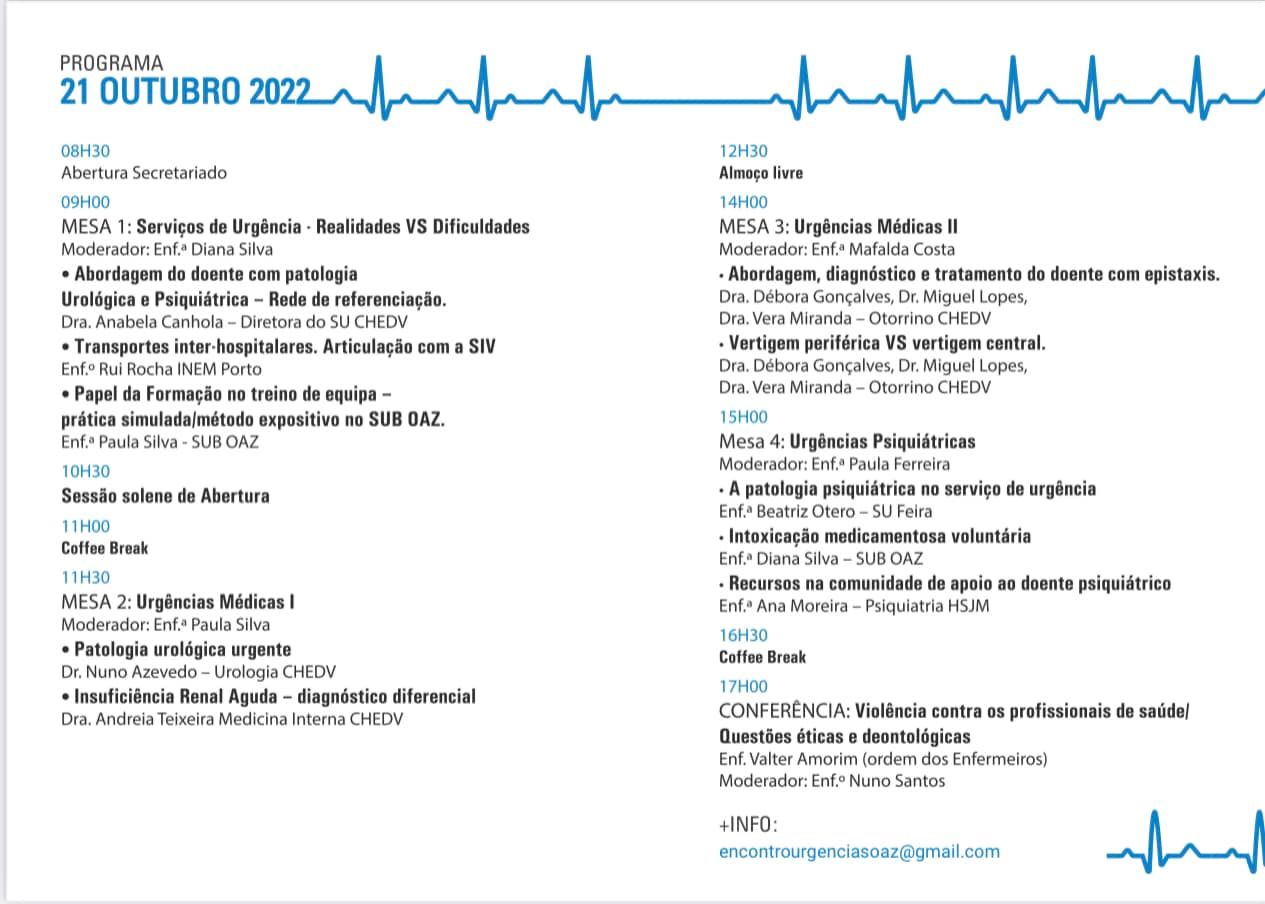 Agendado para dia 21 de outubro, o evento é organizado pelo Serviço de Urgência Básica do Centro Hospitalar Entre Douro e Vouga, EPE - Unidade de Oliveira de Azeméis e é dirigido a enfermeiros e médicos dos serviços de Urgência.