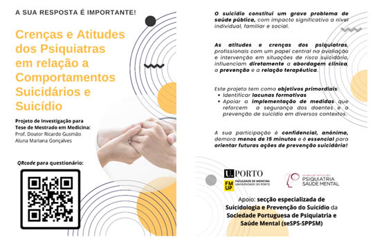 "A prevenção do suicídio não depende apenas de protocolos clínicos, mas também da forma como os profissionais percecionam o fenómeno e os próprios doentes. Compreender esta dimensão humana é fundamental para melhorar a prática clínica e transformar a prevenção em saúde mental numa intervenção mais humana, eficaz e fundamentada em evidência. Pede-se a todos os psiquiatras e internos de Psiquiatria que colaborem neste estudo."