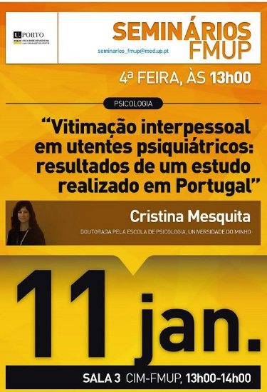 A Faculdade de Medicina da Universidade do Porto (FMUP) promove amanhã, 4.ª feira, mais um seminário, onde será abordado o tema: "Vitimação interpessoal em utentes psiquiátricos: resultados de um estudo realizado em Portugal".