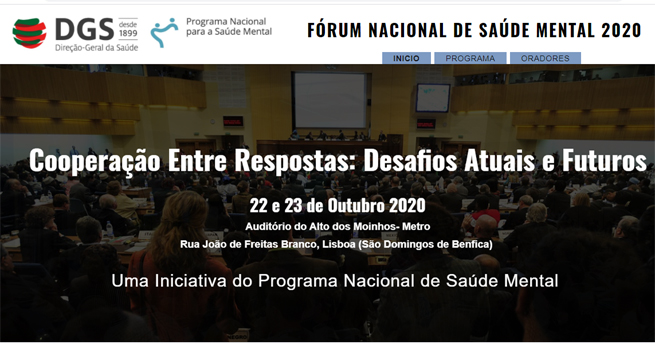 É sob o lema "Cooperação Entre Respostas: Desafios Atuais e Futuros" que se realiza, nos dias 22 e 23 de outubro de 2020, o Fórum Nacional de Saúde Mental. O evento, que é uma iniciativa do Programa Nacional de Saúde Mental, realiza-se pela primeira vez, sendo esta edição dedicada à área da Reabilitação Psicossocial, Profissional e Economia Social.
