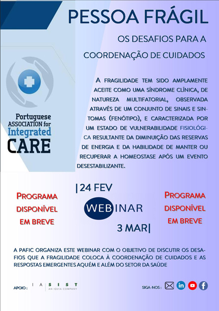 Organizado pela Portuguese Association for Integrated Care (PAfIC), o webinar "Pessoa frágil - Os desafios para a coordenação de cuidados" realiza-se dia 24 de fevereiro e no dia 3 de março de 2022.