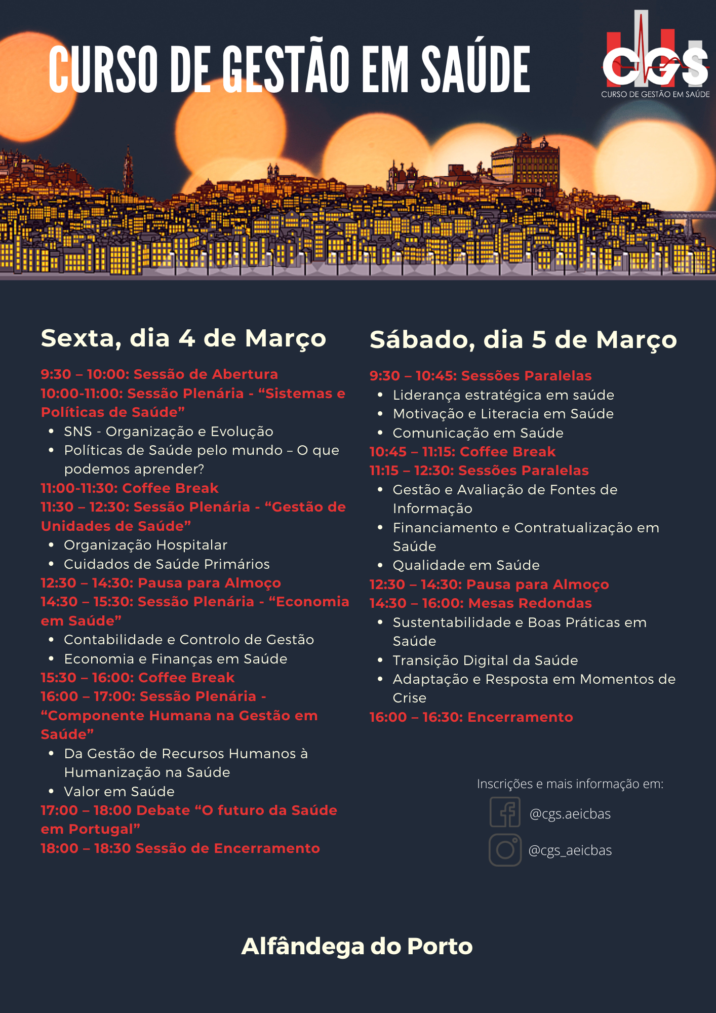 "Um evento que reúna as gerações de atuais e futuros líderes e gestores dos serviços de Saúde." É desta forma que é apresentado o II Curso de Gestão em Saúde (CGS). Agendado para dias 4 e 5 de março de 2022, é organizado pela Associação de Estudantes do Instituto de Ciências Biomédicas Abel Salazar (AEICBAS) da Universidade do Porto.