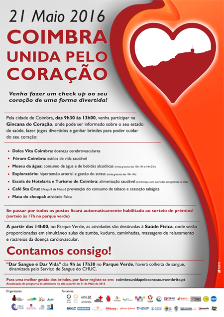 Dia 21 de maio, sábado, vai realizar-se em Coimbra uma iniciativa onde os participantes podem ser informados sobre "o seu estado de saúde, fazer jogos divertidos e ganhar brindes para poder cuidar do seu coração".
