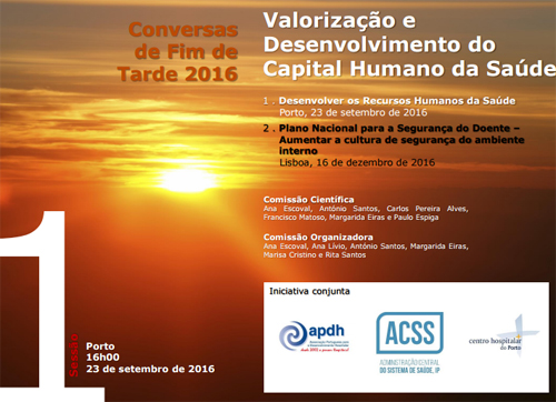 A Associação Portuguesa para o Desenvolvimento Hospitalar (APDH) vai organizar, em parceria com a Administração Central do Sistema de Saúde (ACSS) e o Centro Hospitalar do Porto, um debate sobre o desenvolvimento dos profissionais que desenvolvem atividades na área da saúde. A ação desenvolve-se no âmbito do projeto "Conversas de fim de tarde 2016".