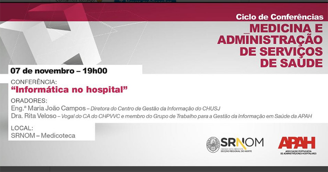 A conferência dedicada ao tema "Informática no hospital" contará com as intervenções de Maria João Campos, diretora do Centro de Gestão da Informação do Centro Hospitalar Universitário de São João, e Rita Veloso, vogal do Conselho de Administração do Centro Hospitalar de Vila Nova de Gaia/Espinho e membro do Grupo de Trabalho para a Gestão da Informação em Saúde da APAH.