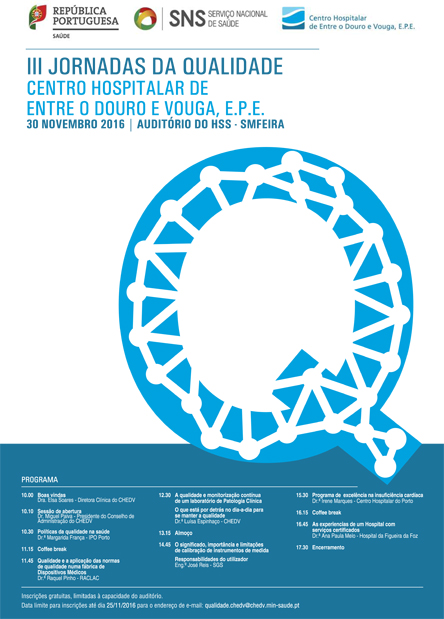 A Unidade de Acreditação e Certificação do Centro Hospitalar de Entre Douro e Vouga (CHEDV) realiza amanhã, com a colaboração do Gabinete de Qualidade e Segurança, as III Jornadas da Qualidade. O evento junta vários especialistas da área, como é o caso de Margarida França, vice-presidente da APAH - Associação Portuguesa de Administradores Hospitalares e presidente da Sociedade Portuguesa para a Qualidade na Saúde (SPQS), que desenvolverá o tema: "Políticas da qualidade na saúde".