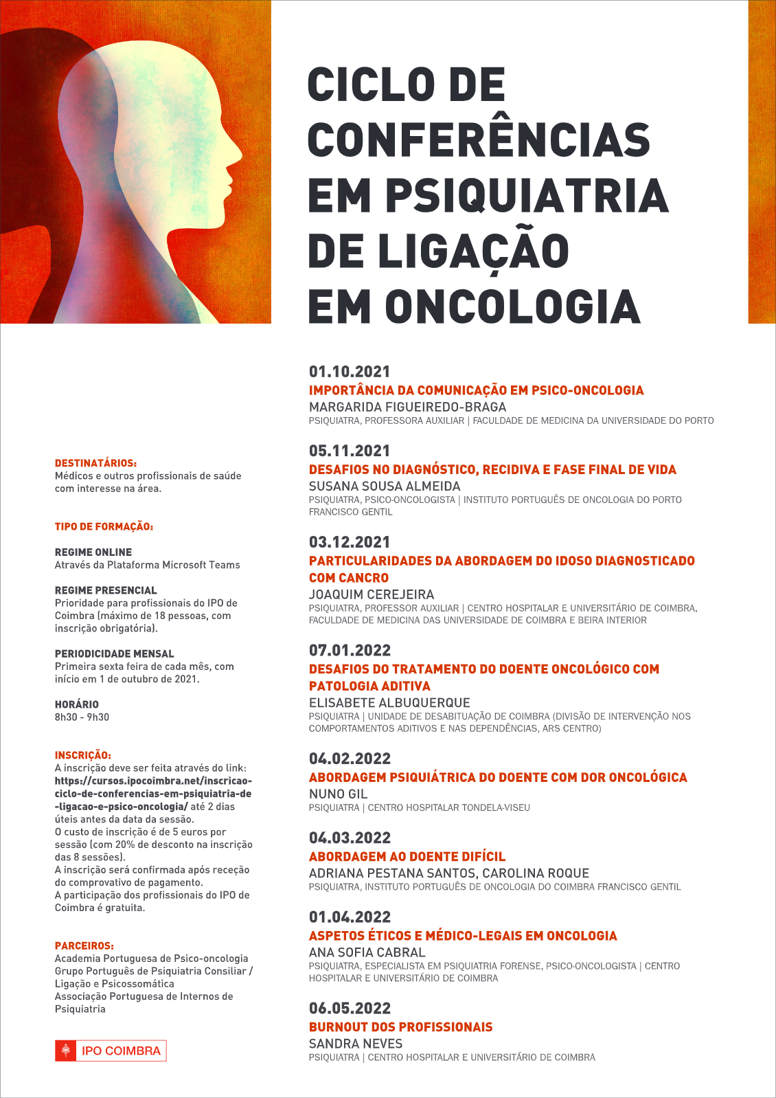 Dirigido a profissionais de saúde, está a decorrer o Ciclo de Confererências em Psiquiatria de Ligação em Oncologia, organizado pelo IPO de Coimbra.
