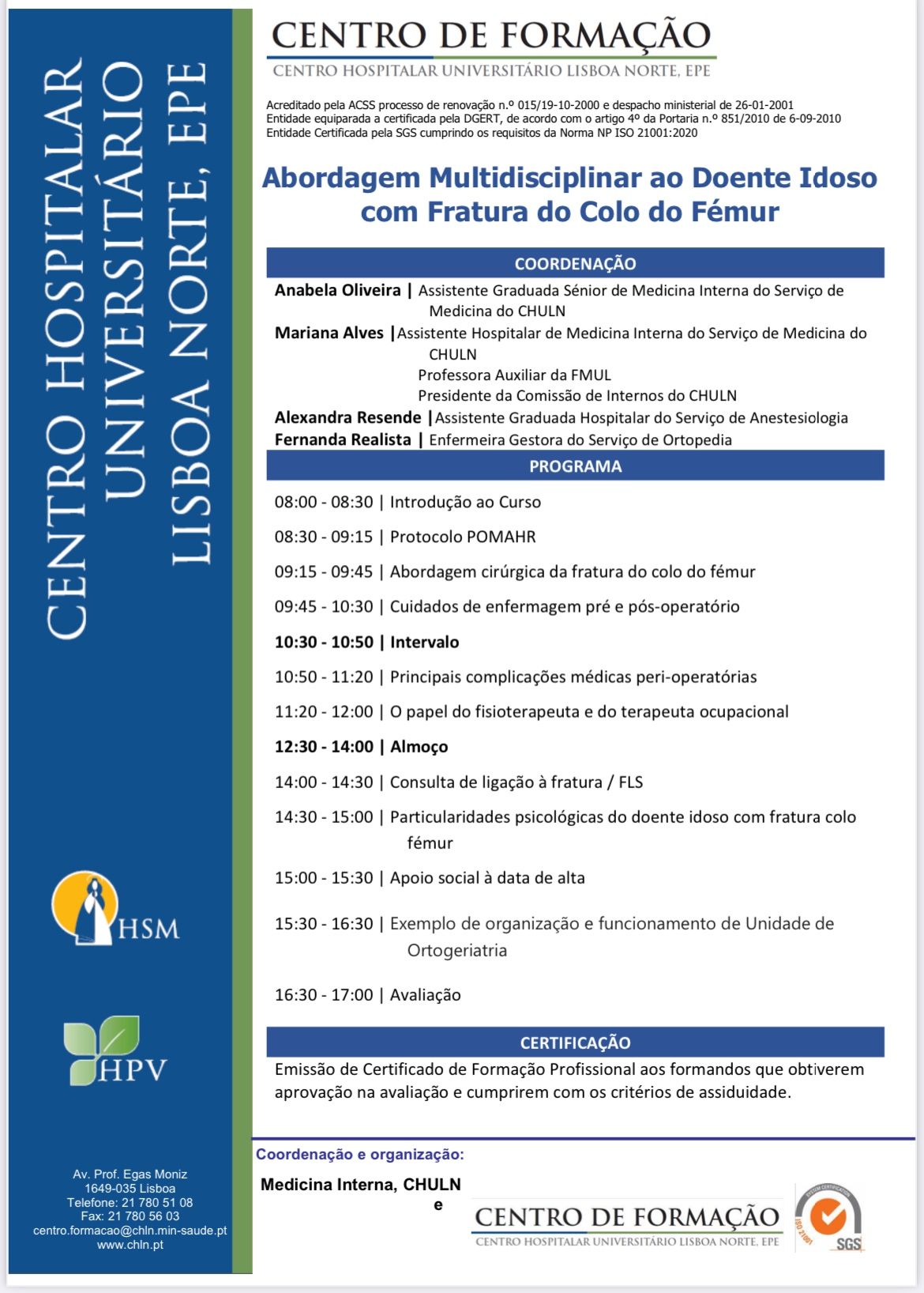 Está agendada para o dia 14 de dezembro de 2023, uma formação organizada pelo Centro Hospitalar Universitário Lisboa Norte (CHULN) subordinada ao tema "Abordagem multidisciplinar ao doente idoso com fratura do colo do fémur", que terá lugar em Lisboa.