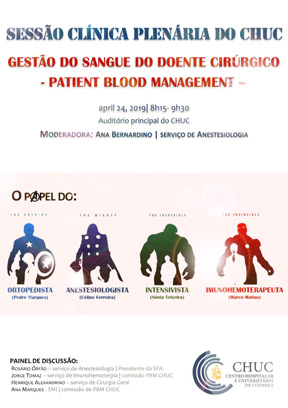 O Auditório principal do Centro Hospitalar e Universitário de Coimbra (CHUC) acolhe esta quarta-feira, 24 de abril, uma sessão sobre o Patient Blood Management (PBM). O debate dedicado a este programa de gestão do sangue será moderado por Ana Bernardino, do Serviço de Anestesiologia.