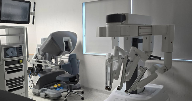 O robô cirúrgico é composto por quatro braços giratórios e elevatórios, conectados a pinças de alta precisão que garantem uma abordagem segura e minimamente invasiva. O procedimento é comandado por um cirurgião, que controla os movimentos dos braços do robô com as mãos e as funções das pinças através de pedais.