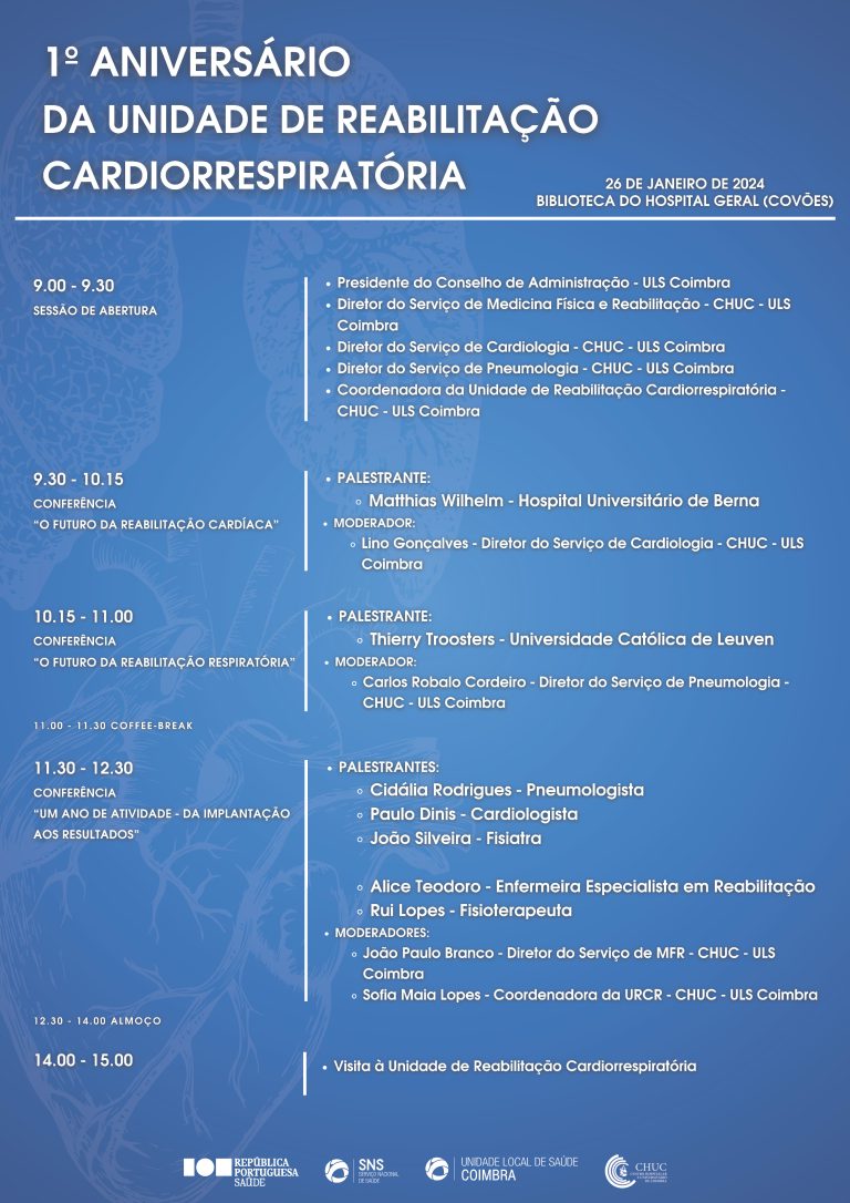 Intitulada "Um ano de atividade - da implantação aos resultados", a terceira conferência terá um conjunto de palestrantes da ULS Coimbra: Cidália Rodrigues, pneumologista, Paulo Dinis, cardiologista, João Silveira, fisiatra, Alice Teodoro, enfermeira de Reabilitação, e Rui Lopes, fisioterapeuta.